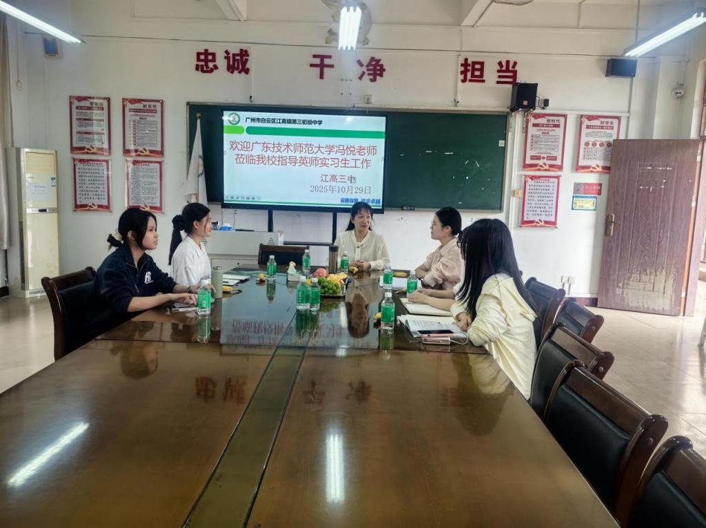 为进一步了解我院实习生教育实习情况,冯悦老师于 2025年10月29日走访了江高镇第三中学,看望了在该校实习的师范生张鑫宜、卢嘉瑜、陈佩泫和谢小夏同学,并与带教老师代表唐老师进行了座谈和交流。在座谈中三中带教老师的总体反馈是实习学生们态度端正,而且能积极参与到学校的各项工作中去,他们的表现得到了校方的认可和赞扬。