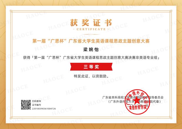 6. 2021年首届“广思杯”广东省大学生“学外语,讲党史,强自信,勇担当”主题创意大赛暨首届“广思杯”广东省英语思政创意大赛中,外国语学院团队指导的欧忠林同学及陈广萍同学分别获得英语组二等奖和三等奖,梁婉怡同学获得非英语组三等奖,我校获得优秀组织奖。
