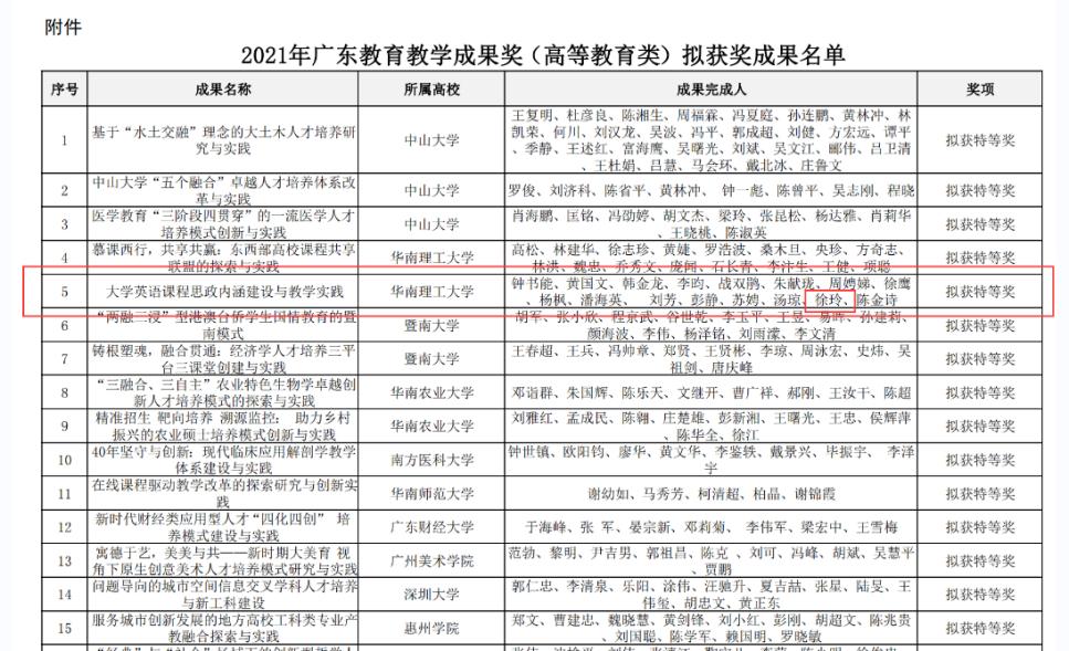 1. 外国语学院徐玲教授参与的项目《大学英语课程思政内涵建设与实践成果》获2021广东省教育教学成果奖省级特等奖。
