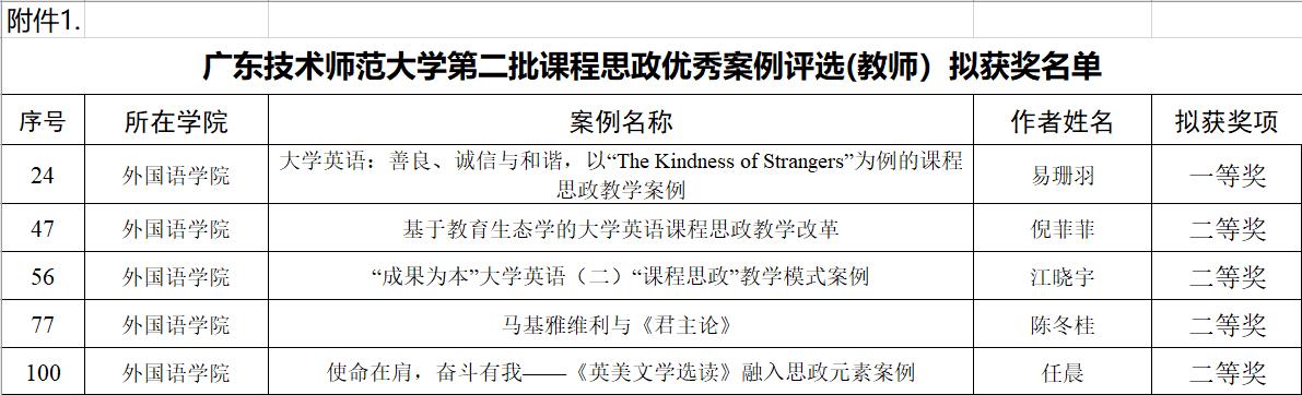 3. 外国语学院获得2021年广东技术师范大学本科课程思政优秀案例奖项5项。其中: