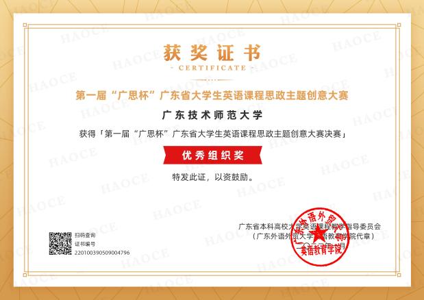 叶薇博士的《聚焦中国情怀和国际视野的综合性商务英语写作》获得广东技术师范大学本科课程思政优秀案例二等奖;