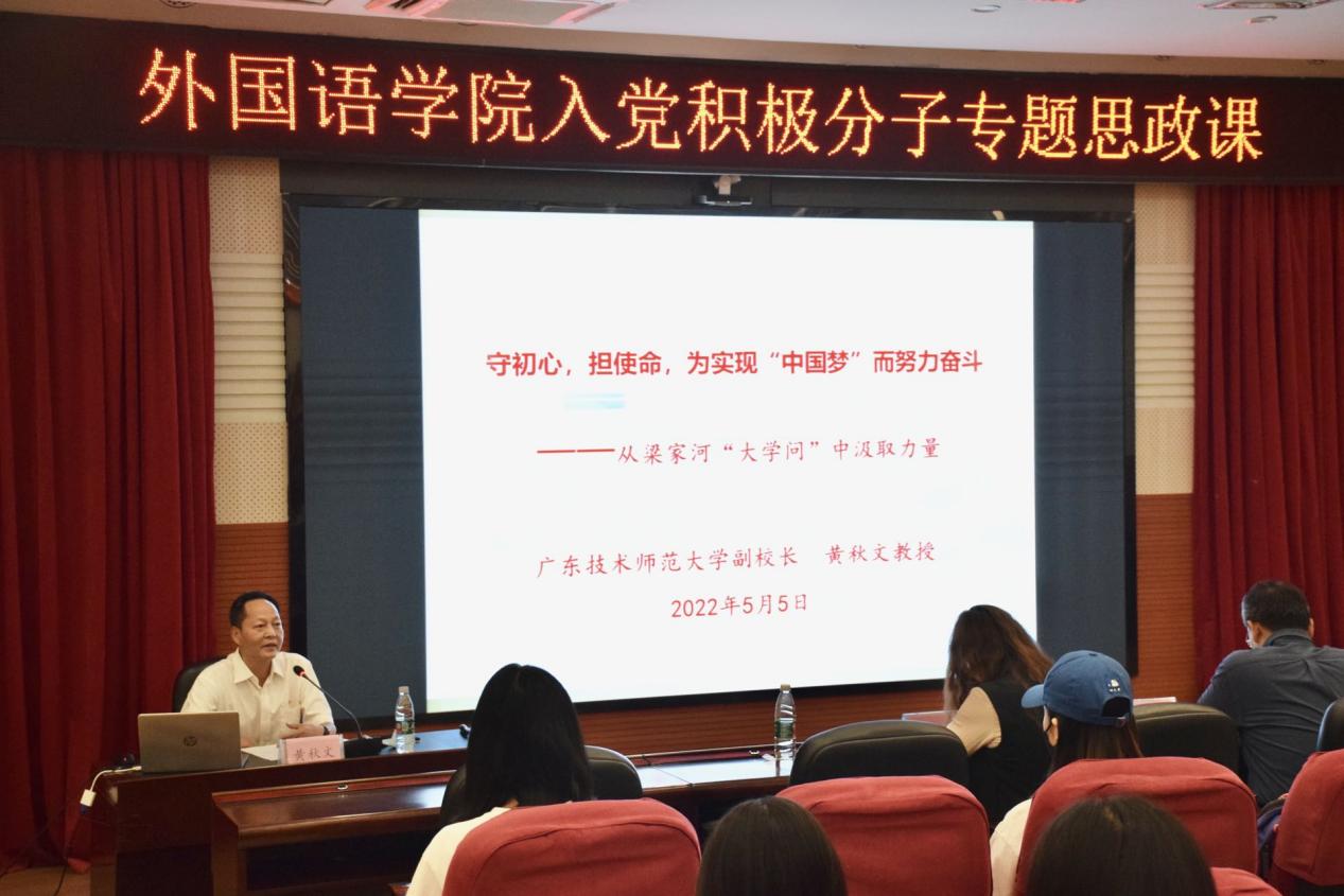 为进一步加强入党积极分子的思想政治教育,引导学生坚定政治信仰,端正入党动机,5月5日,学校党委常委、副校长黄秋文在白云校区学术报告厅为外国语学院入党积极分子讲授专题思政课。外国语学院领导班子、全体辅导员以及全体入党积极分子聆听了授课。