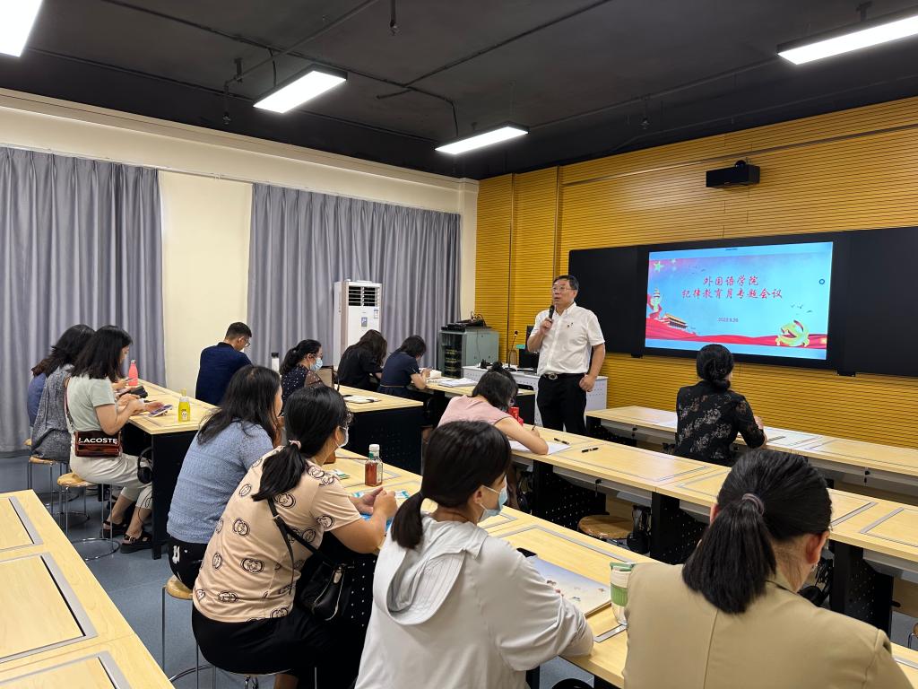 为深入开展警示教育,引导广大教职工以身作则、廉洁自律,落实我校纪律教育学习月活动安排,结合《习近平谈治国理政》第四卷主题学习,9月30日下午,外国语学院通过传达上级会议精神、专题学习、观看警示教育片等方式,积极开展纪律教育学习月活动。活动由外国语学院党委书记杨伟光主持,外国语学院全体教师党员参加了本次活动。