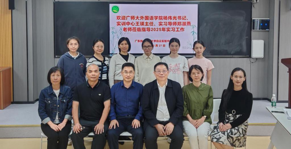 为进一步加强教育实习的过程管理,全面了解本科师范生实习表现和实践收获,推动与实习单位的深度合作,10月27日,外国语学院书记杨伟光带队,与外语实训中心主任王瑛、英语校内实习导师郑淑燕一同前往广东技术师范大学白云实验中学开展教育实习中期检查,白云实验中学书记、校长罗永新、教导处主任龙满标、副主任梁纳萍,办公室主任夏杨梅,英语科组长龙少婷以及我院全体实习生参加了交流会。