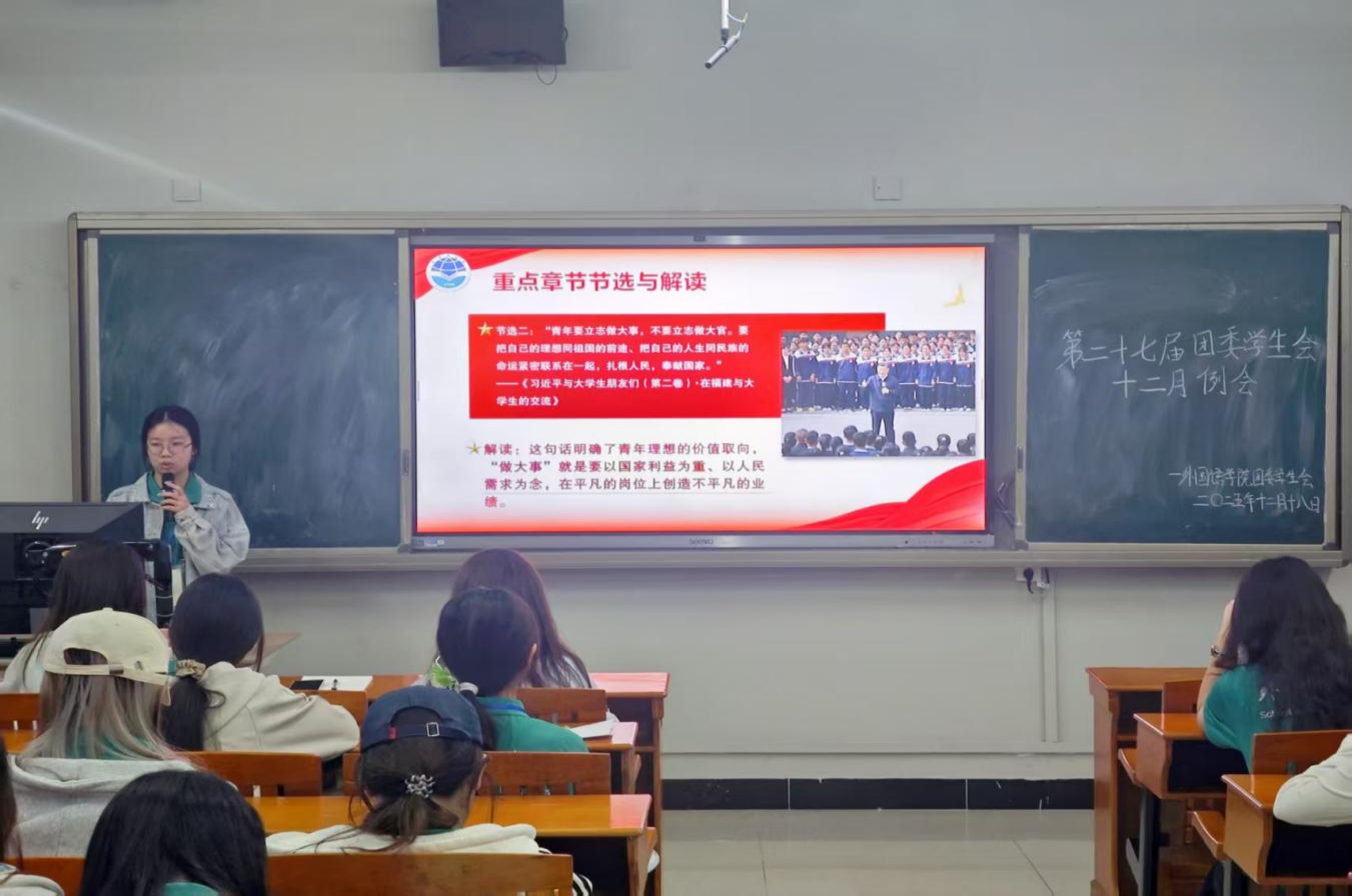 为深入学习贯彻党的二十届四中全会精神,引导团员青年明确时代发展方向,12月18日外国语学院团委组织开展了“党的二十届四中全会专题学习会”,引导学生在理论学习中坚定理想信念,推动学习成果转化为青年成长成才的内生动力。