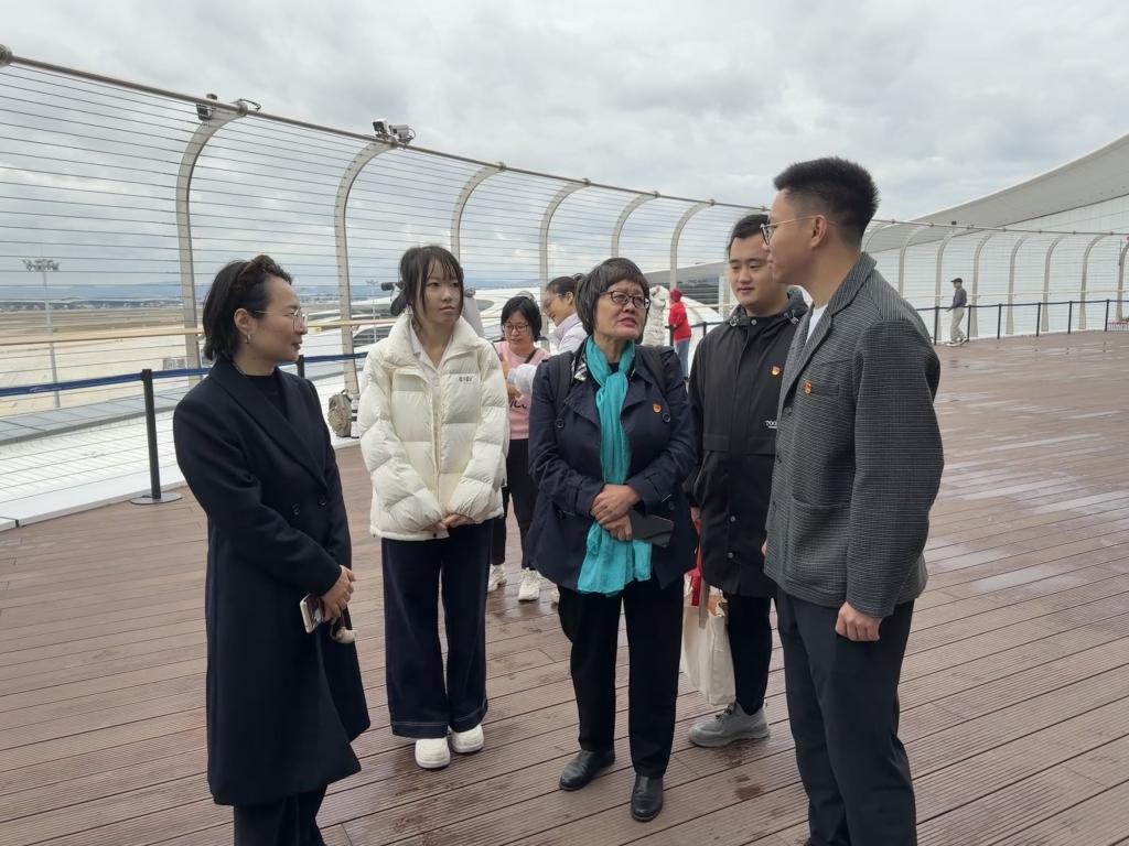 在机场志愿服务现场,刘慧云结合长期教育经历,阐释了“五老”精神在引导青年成长中的重要意义。她与师生围绕“志愿服务与综合素质提升”进行面对面交流,建议青年教师从一线服务中汲取教学案例与研究素材,鼓励学生运用专业特长参与跨文化服务,在实践中学真知、长才干、讲好中国故事。