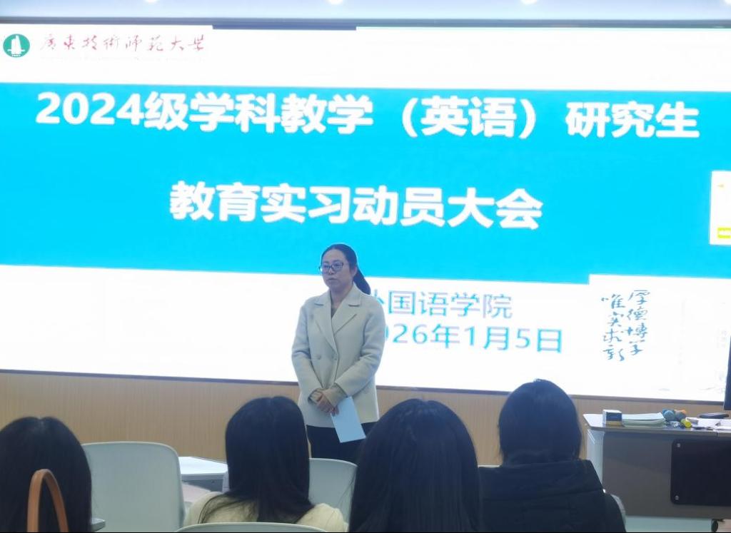 为扎实做好学科教学(英语)专业研究生教育实习组织工作,引导即将进入实习阶段的研究生明确任务、做好准备,外国语学院于2026年1月5日在白云校区第一教学楼430室召开了2024级全日制硕士研究生教育实习动员大会。学院副书记王琴琴、副院长陈倩、研究生辅导员,研究生秘书以及2024级学科教学(英语)专业全日制硕士研究生参加了会议。