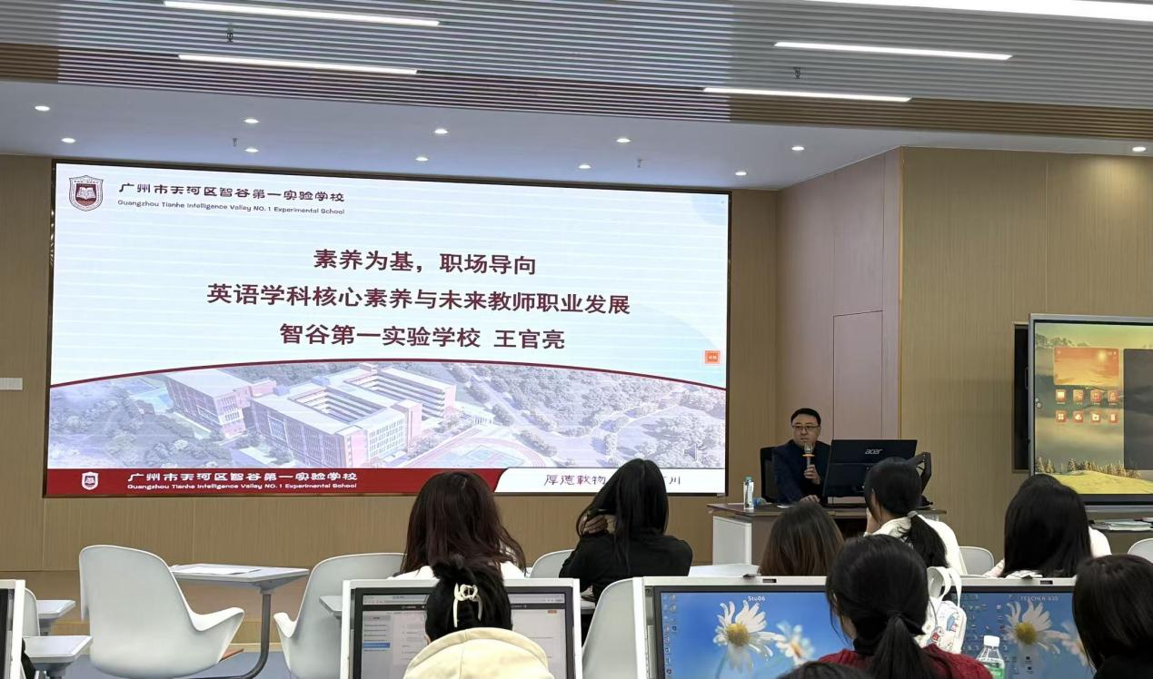 11月27日下午,广州市天河区智谷第一实验学校校长王官亮应邀莅临我校白云校区,在一教430教室为外国语学院师生带来一场卓越师范系列专题讲座。讲座以“素养为基,职场所向:英语学科核心素养与未来职业发展”为主题,王校长开篇即强调英语教师学科核心素养对职业发展的关键作用,随后深入剖析了核心素养的培育策略与实践应用,并结合智谷第一实验学校的办学实践与育人经验,系统分享了教师职业发展的有效路径。本次讲座由外国语学院林筠老师主持,外国语学院副院长王永建、23级英语师范卓越班全体学生以及23-24级英语师范部分学生共同参与。
